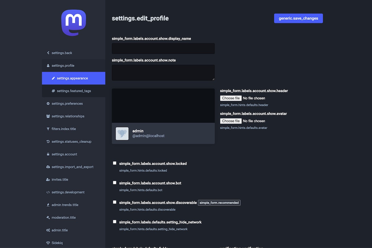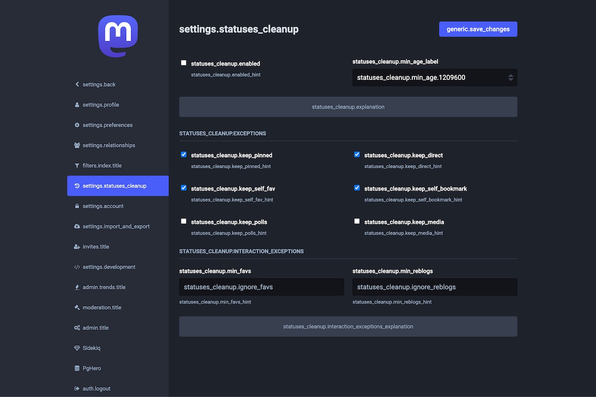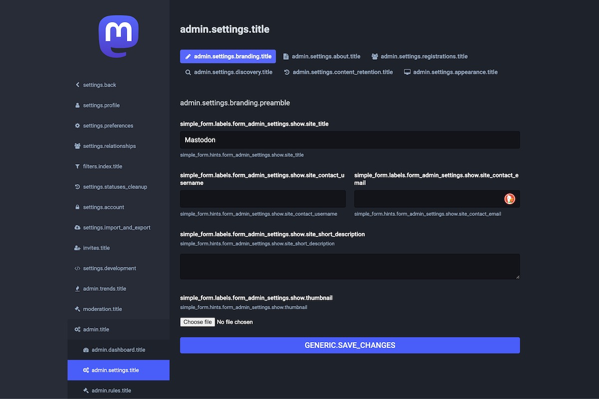 Click the previous slide or next slide links to see all the Mastodon admin pages displayed with i18n keys.