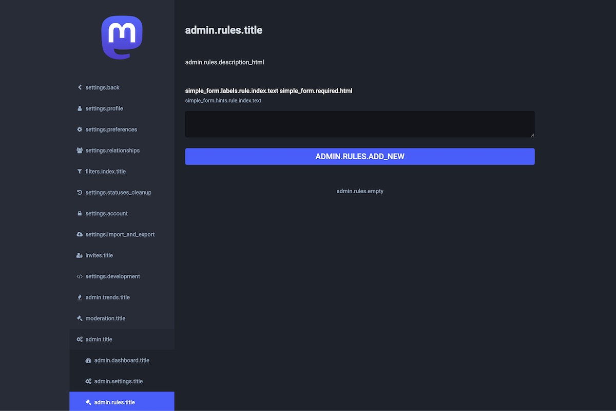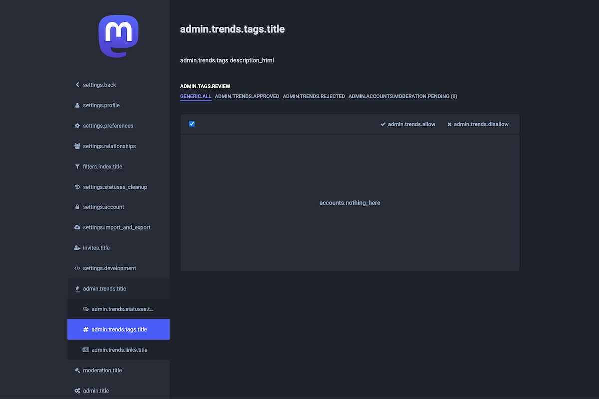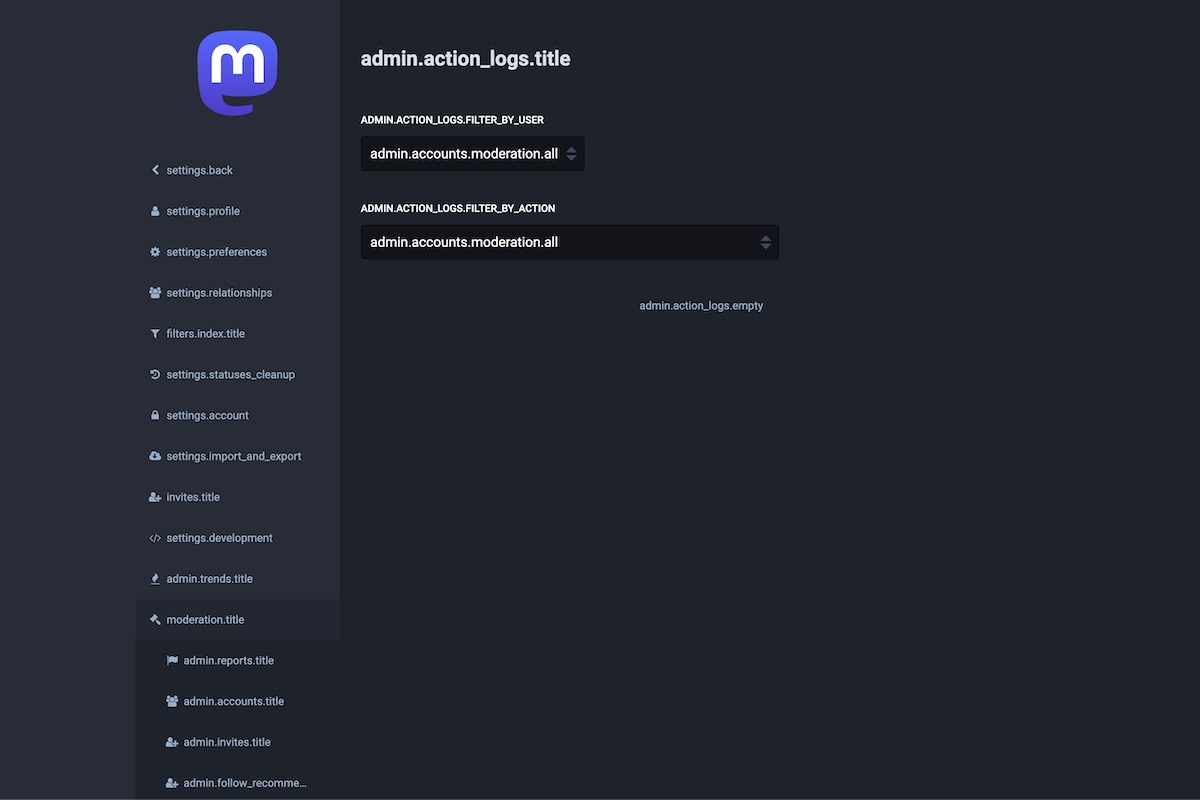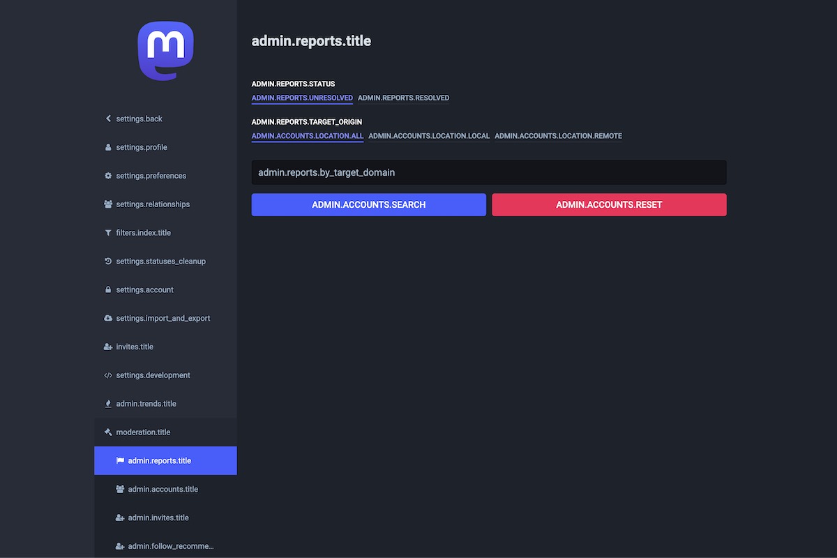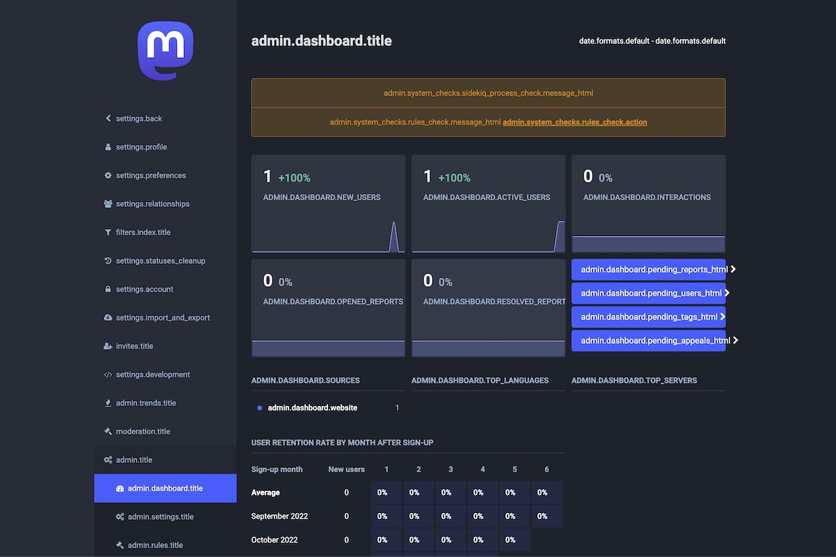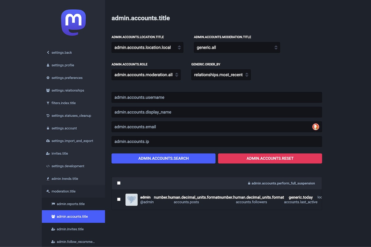 Here is the result of the TranslationKeys module applied on the Mastodon Admin Dashboard.