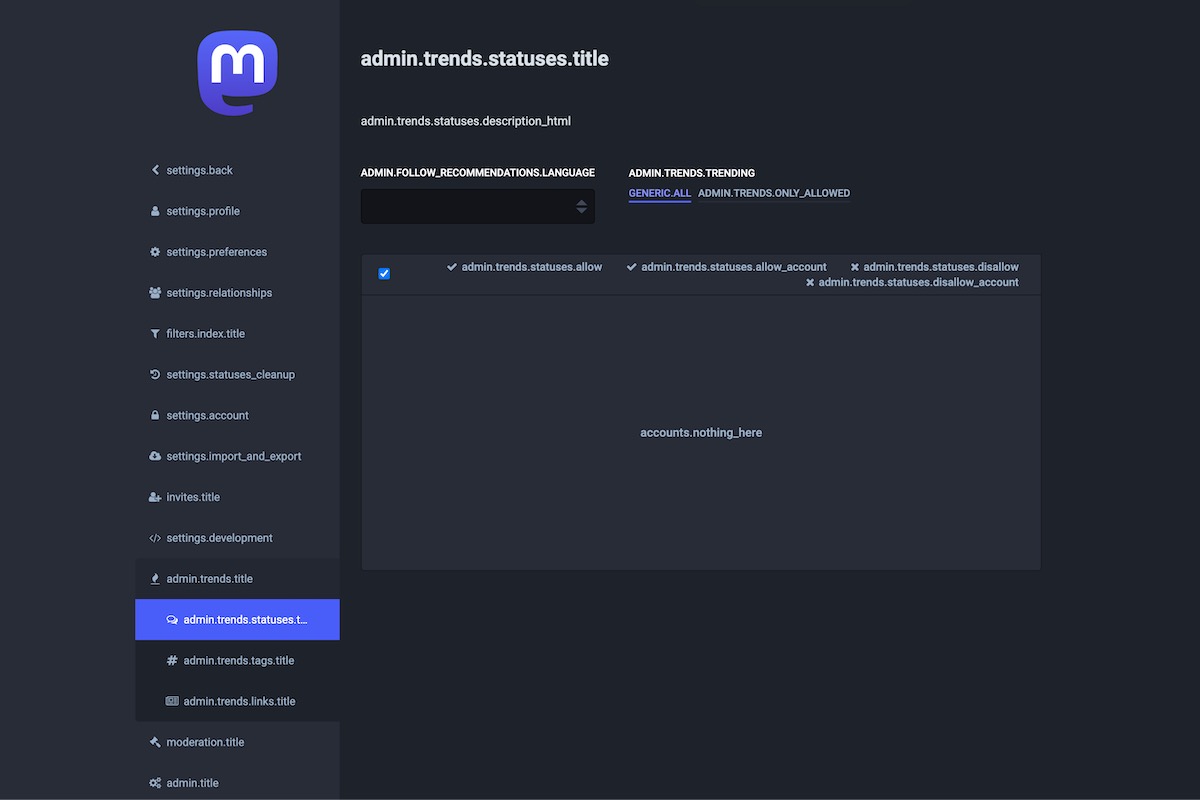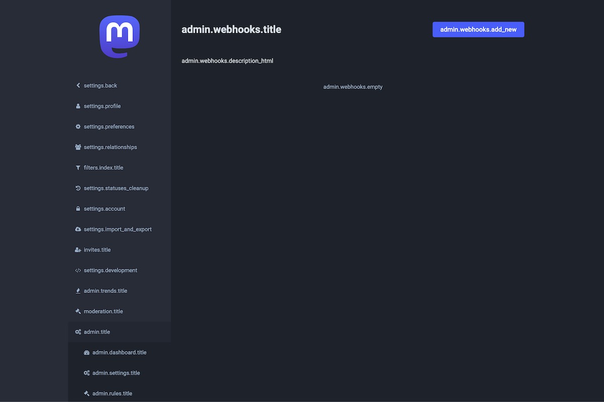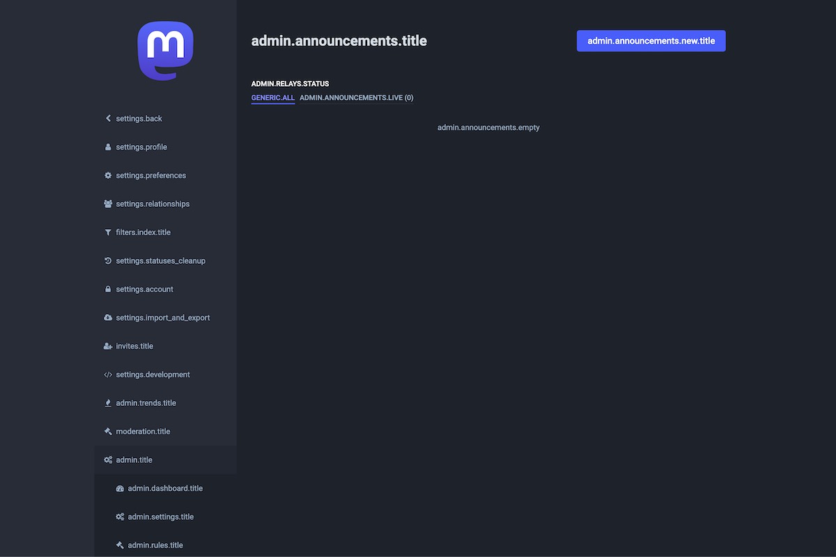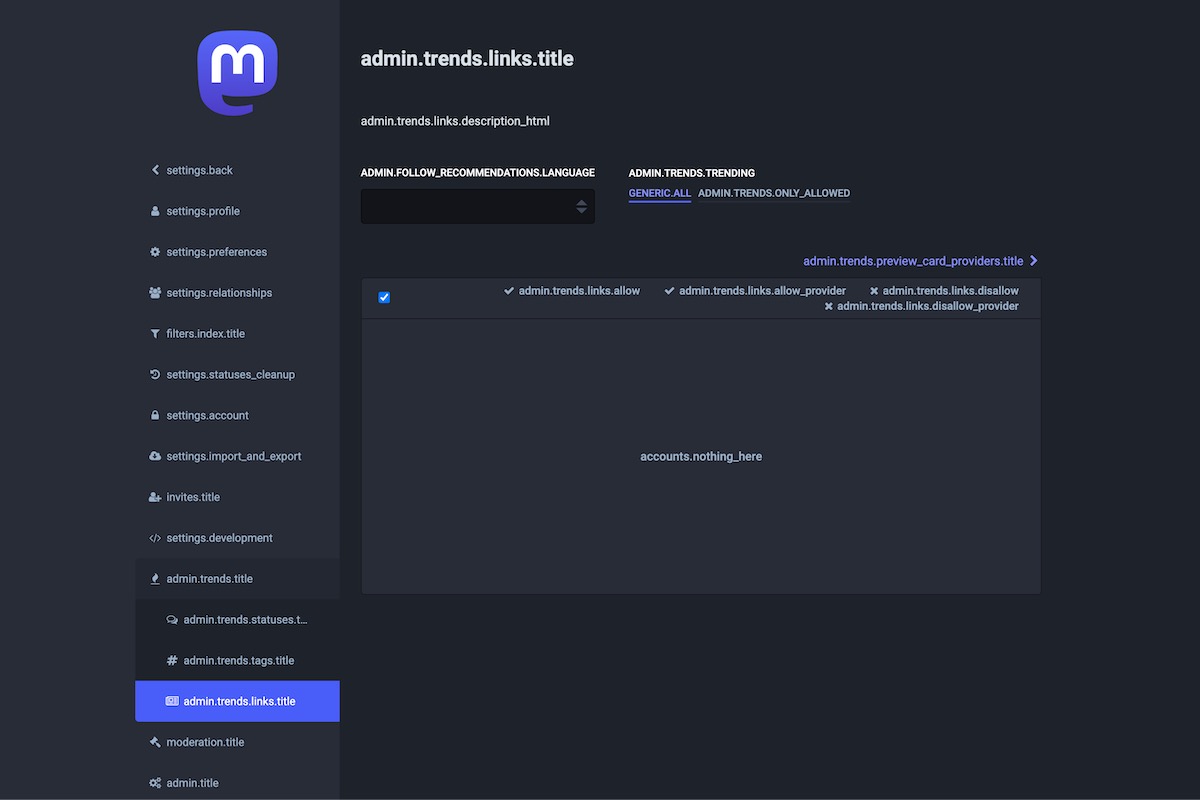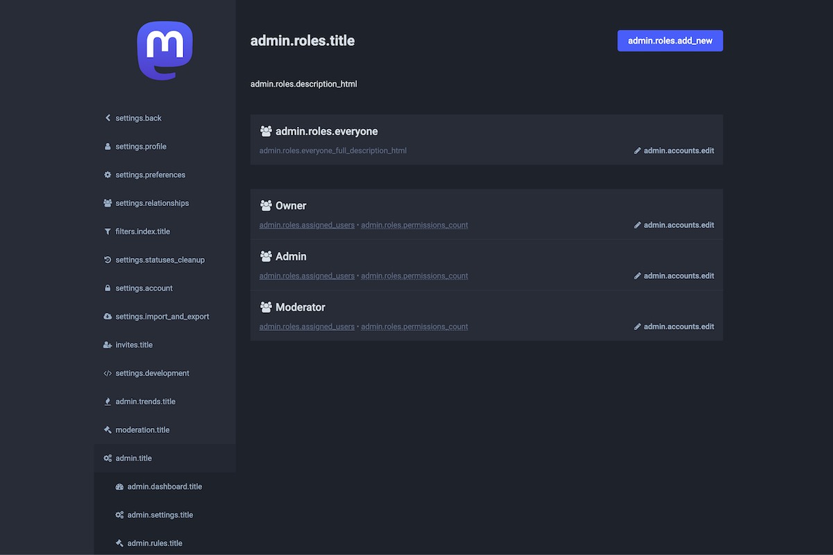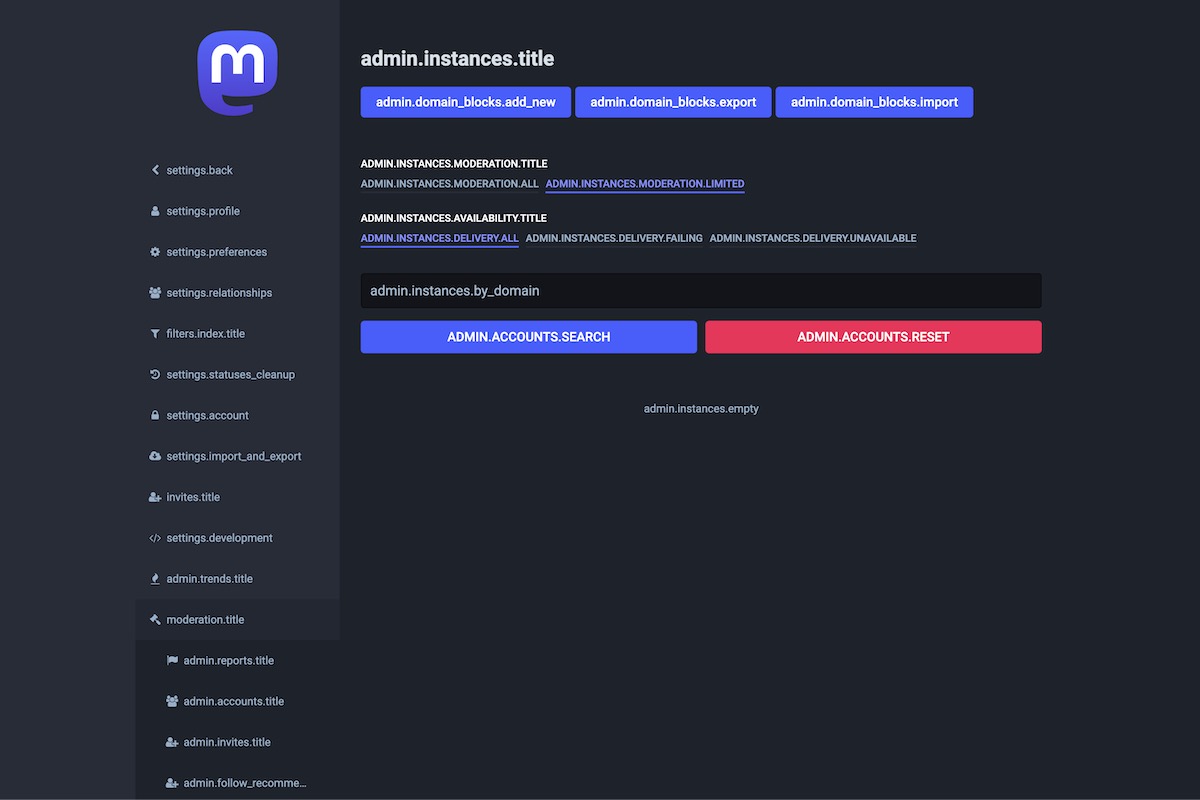 Here is the result of the TranslationKeys module applied on the Mastodon Admin Dashboard.
