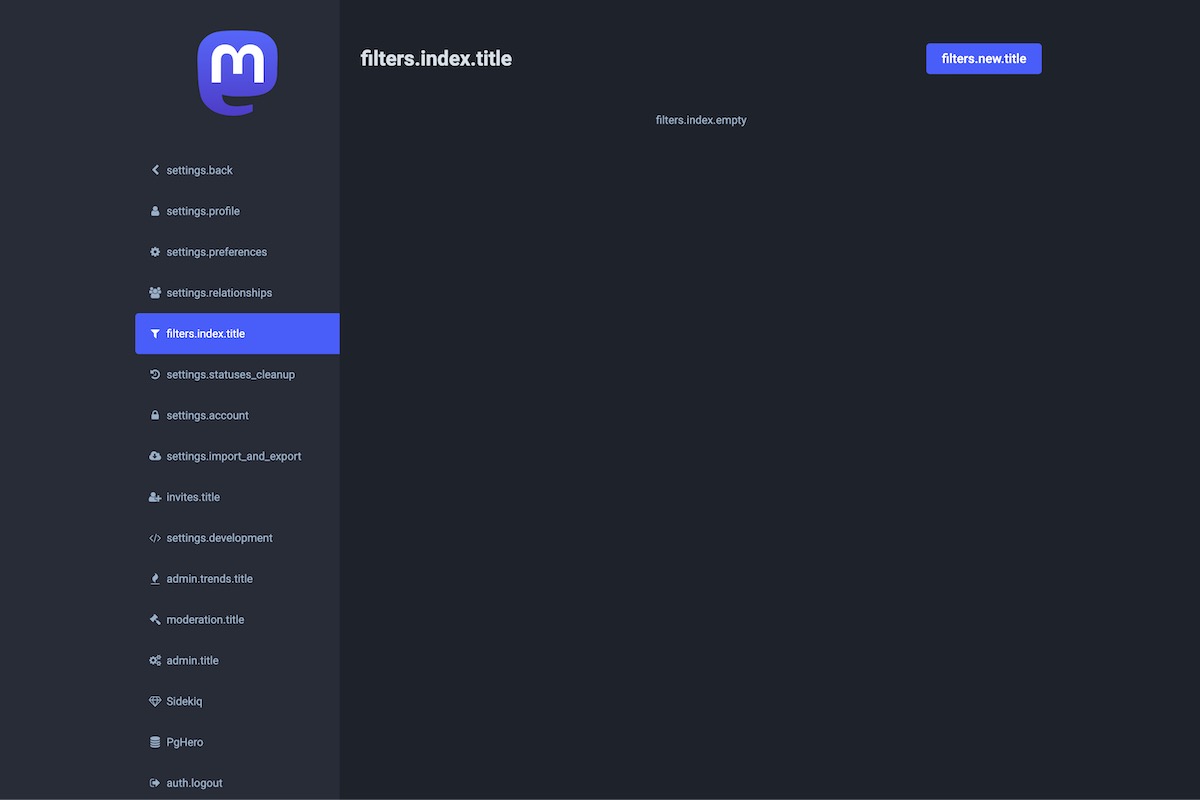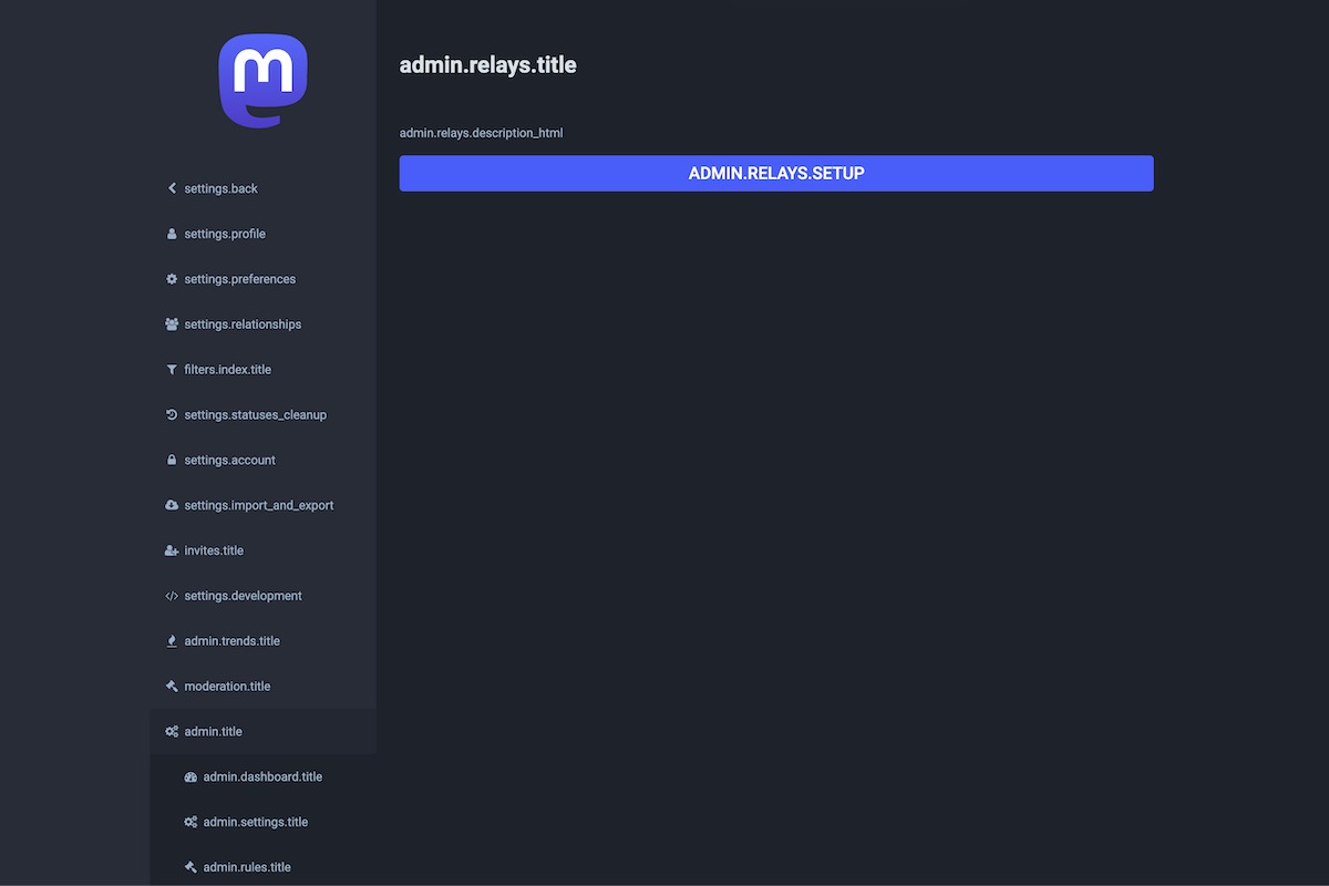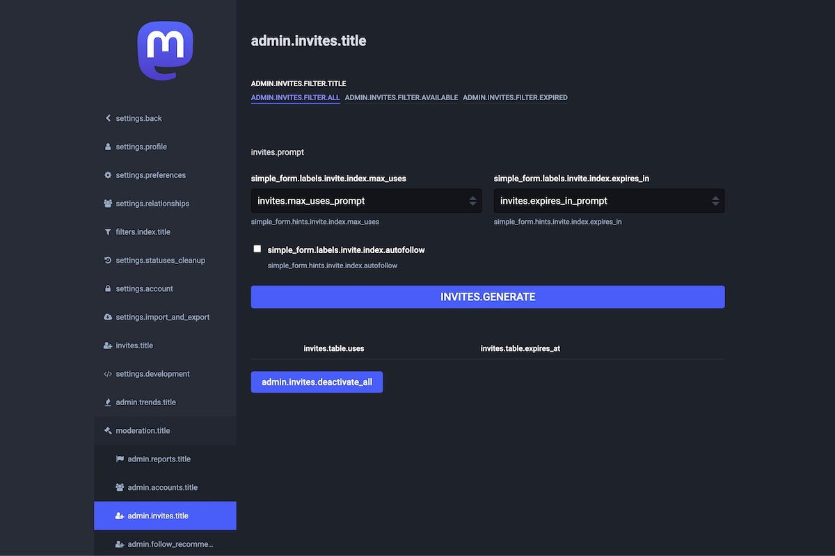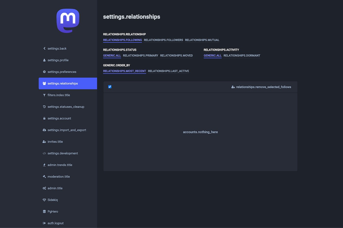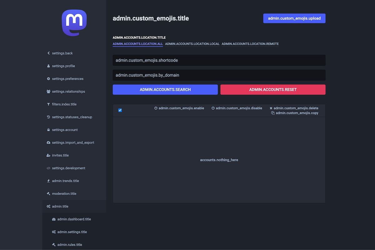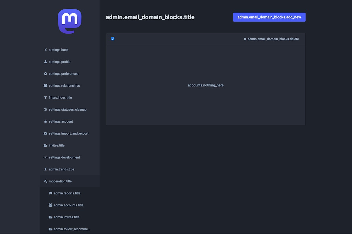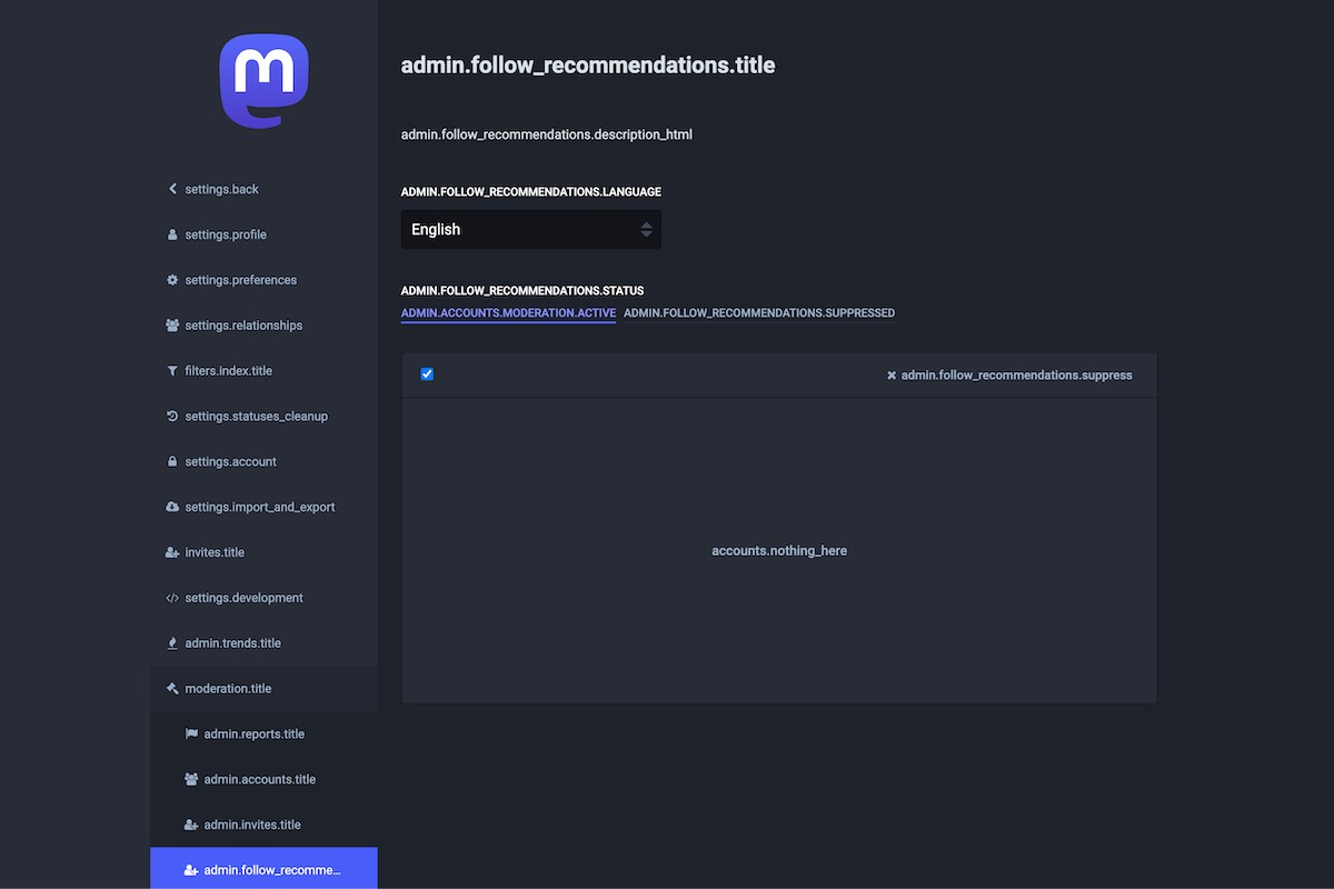 Here is the result of the TranslationKeys module applied on the Mastodon Admin Dashboard.