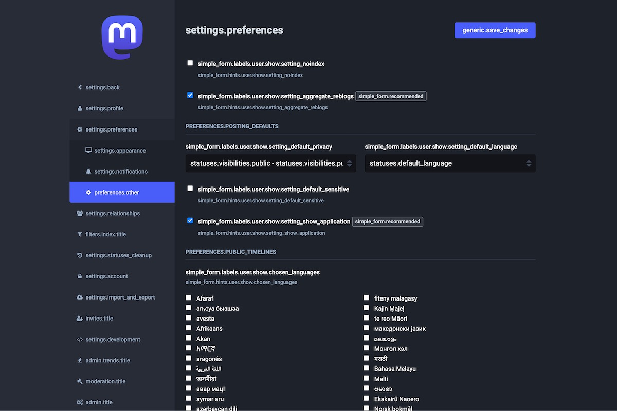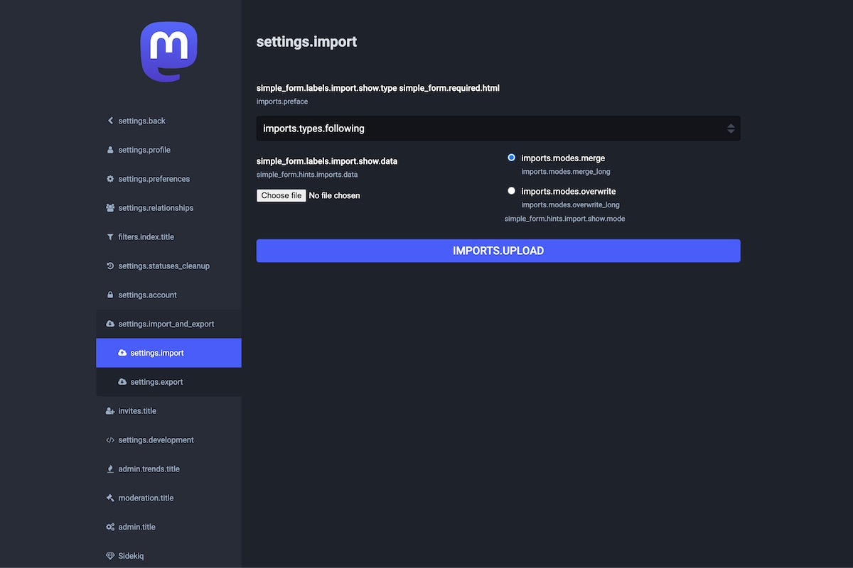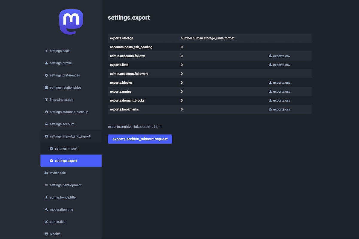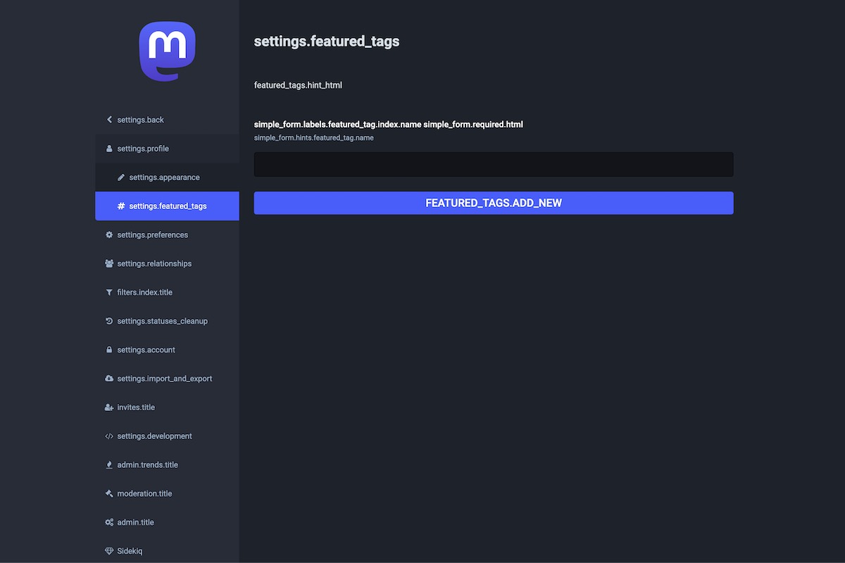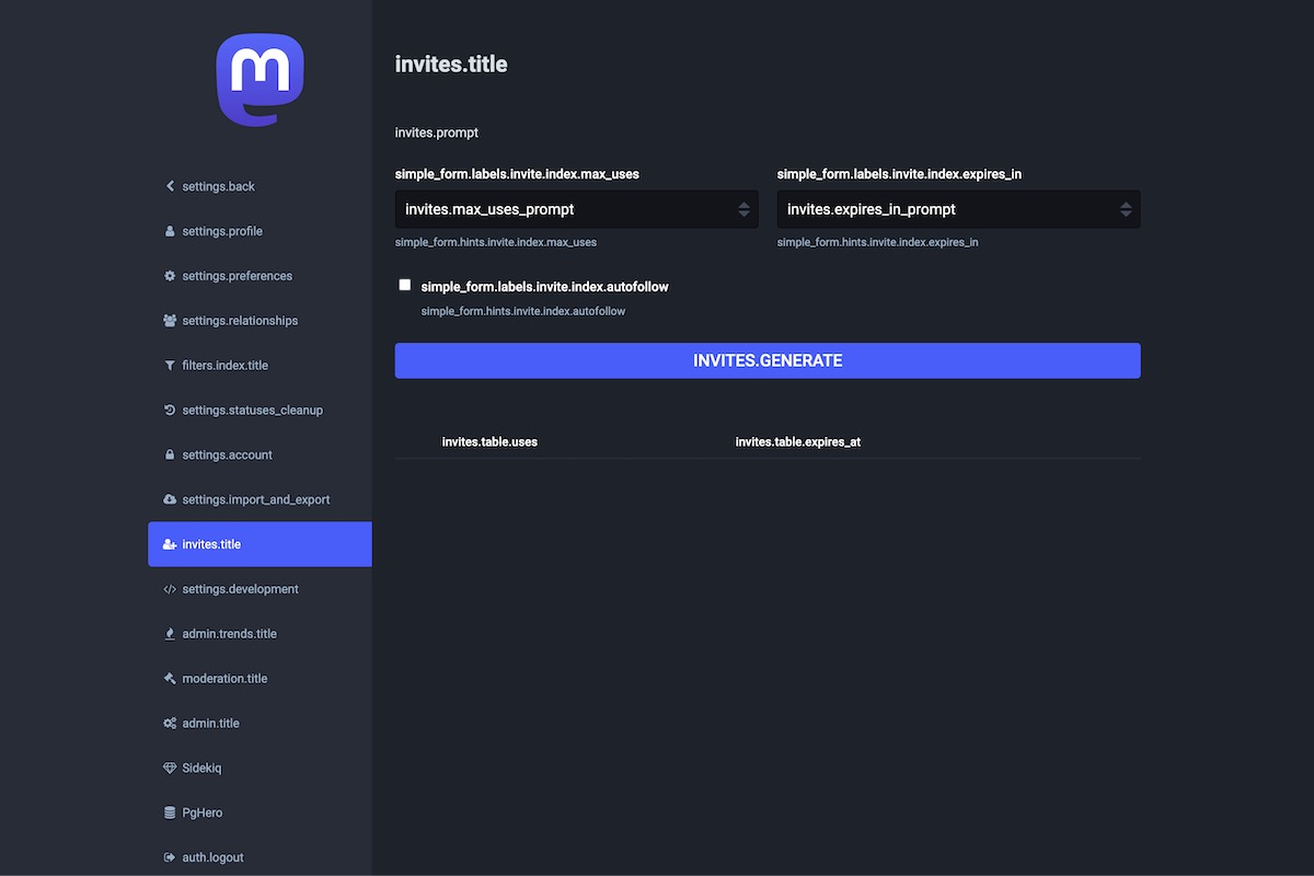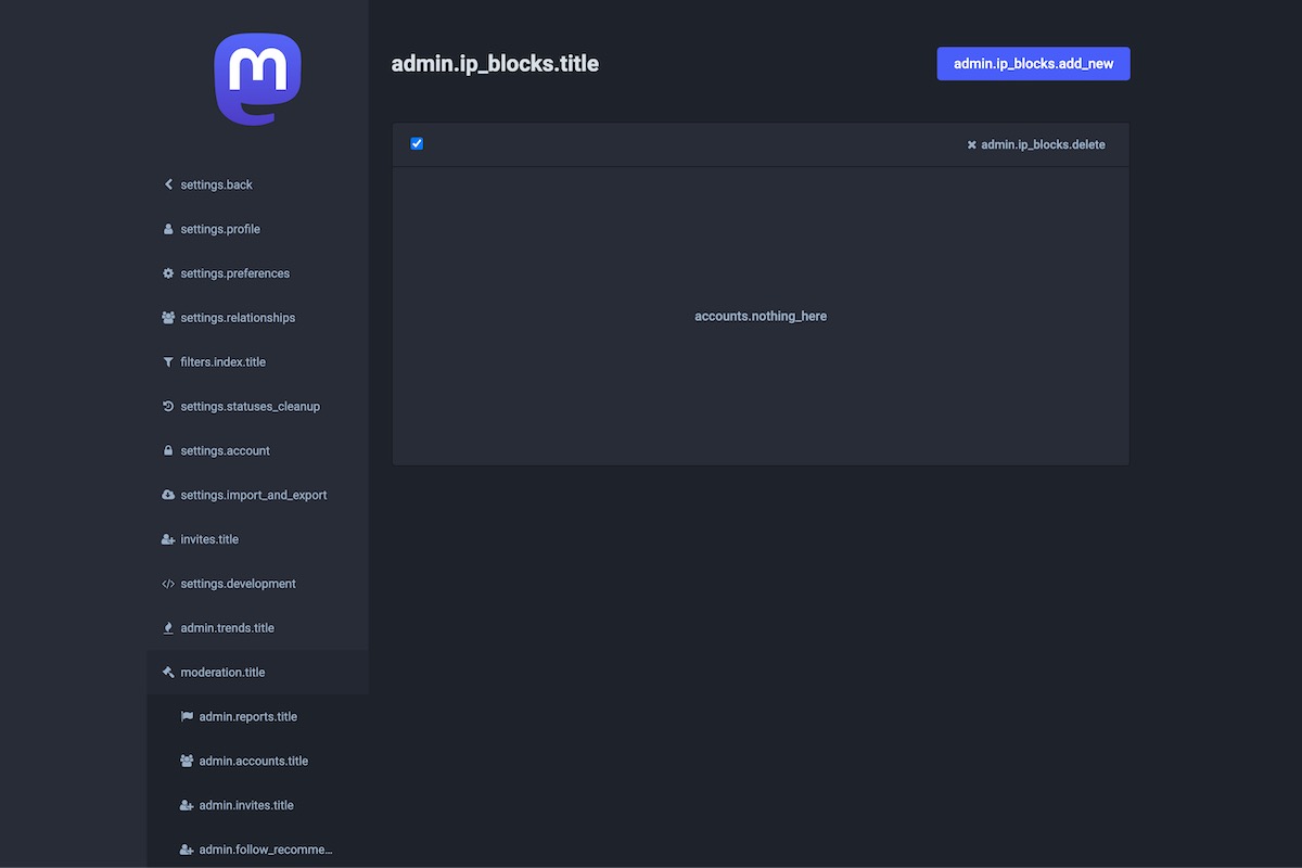 Here is the result of the TranslationKeys module applied on the Mastodon Admin Dashboard.