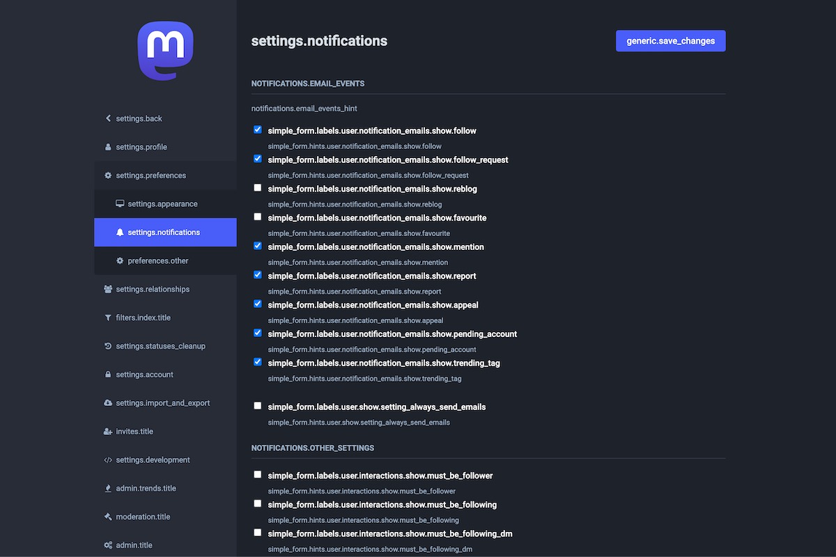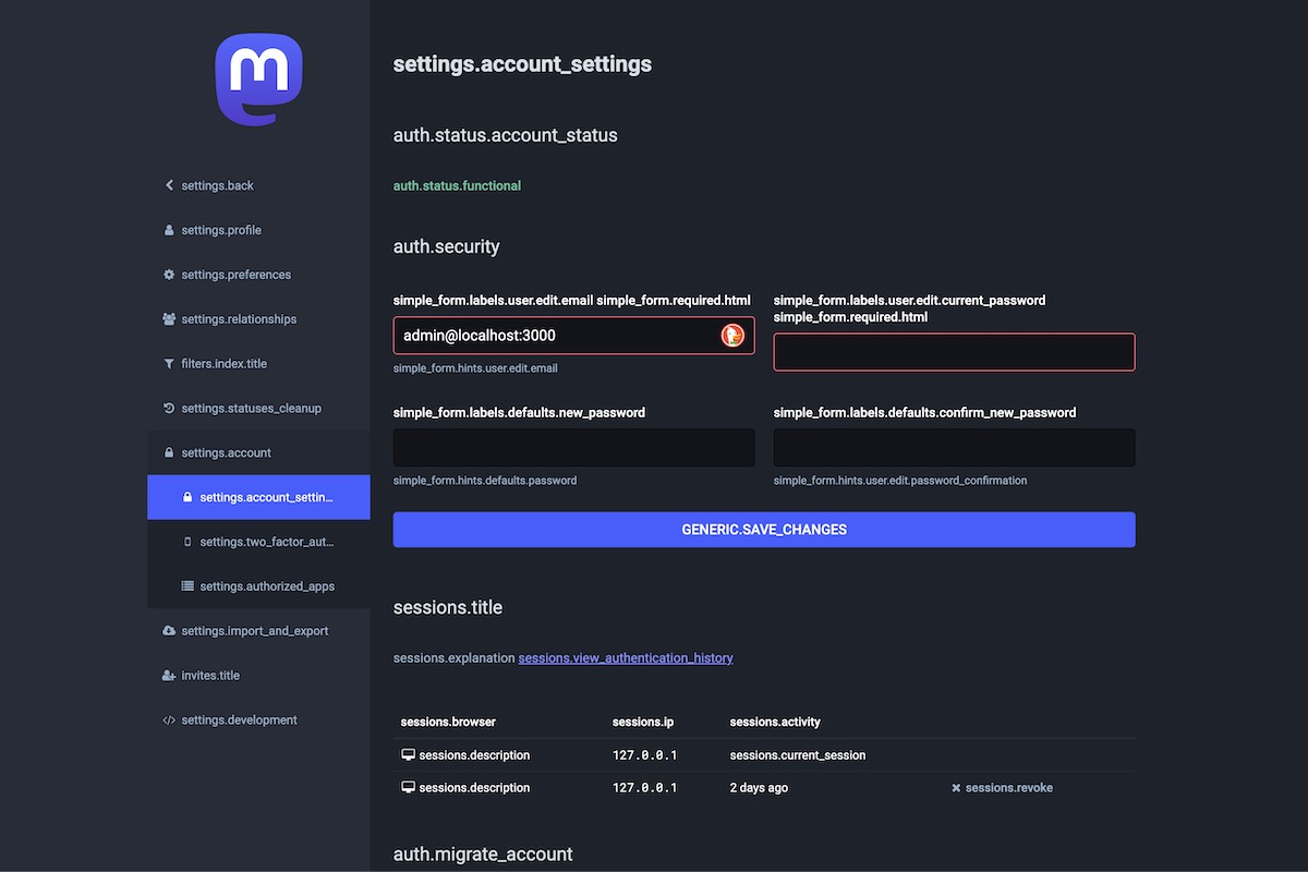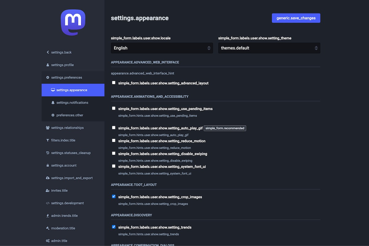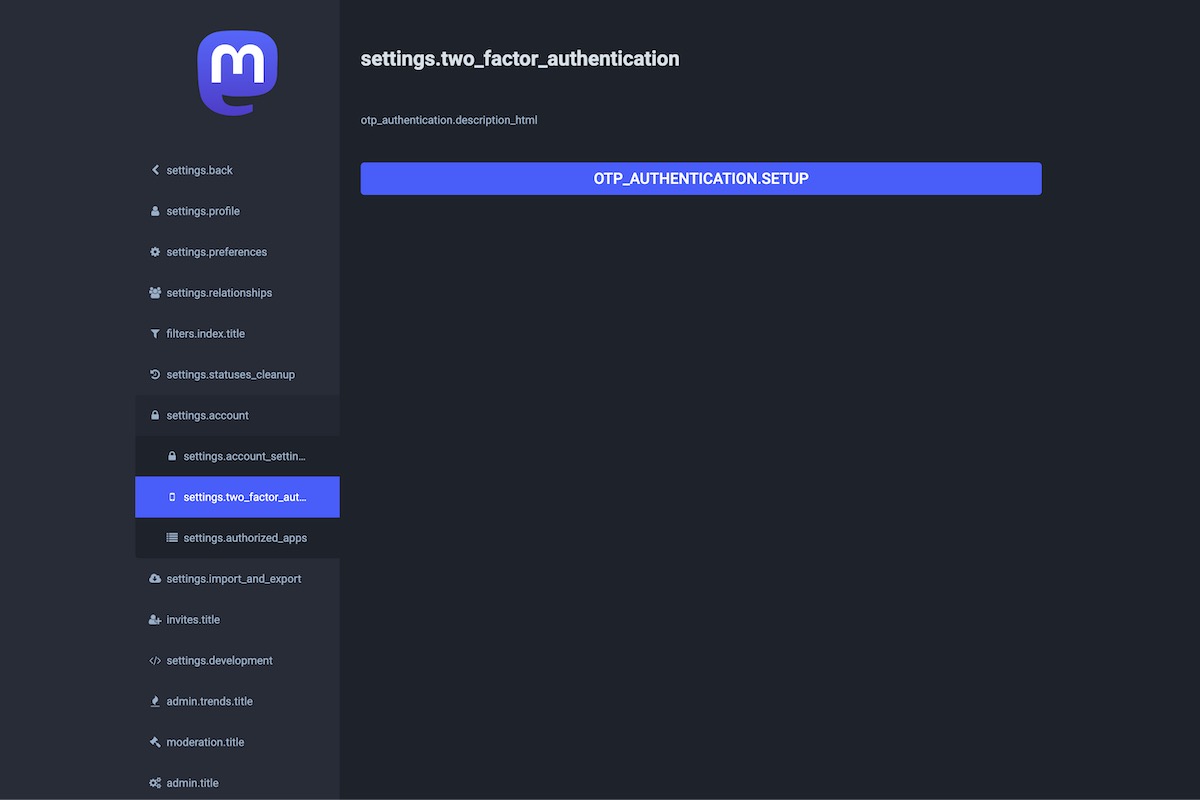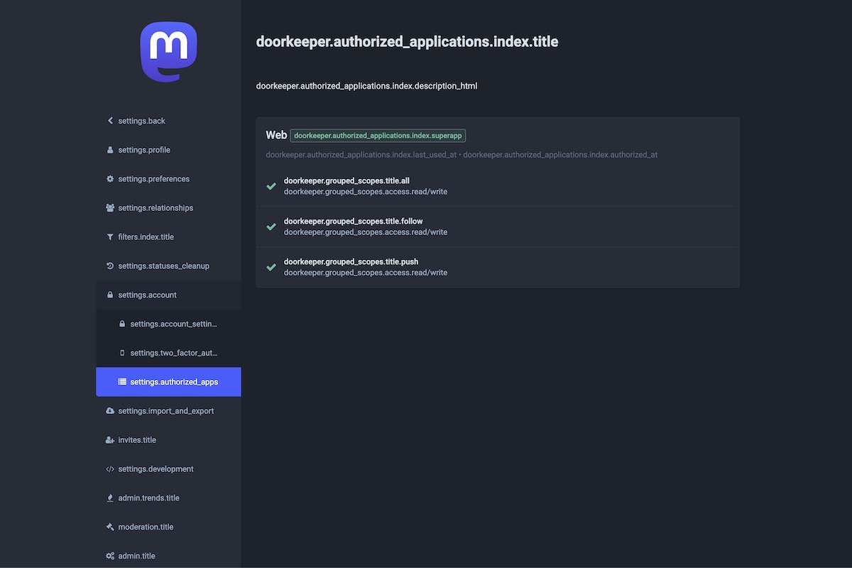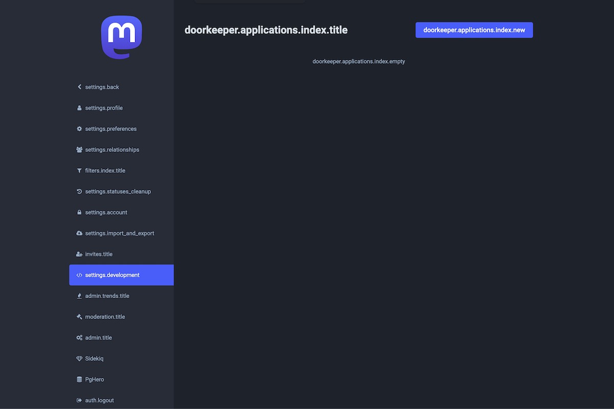 Here is the result of the TranslationKeys module applied on the Mastodon Admin Dashboard.